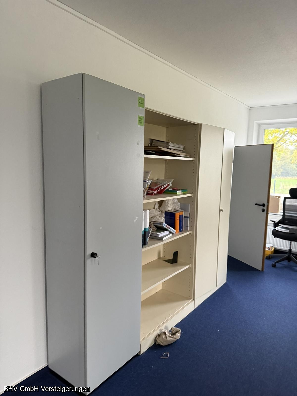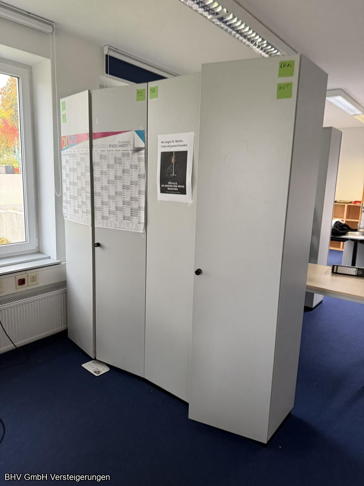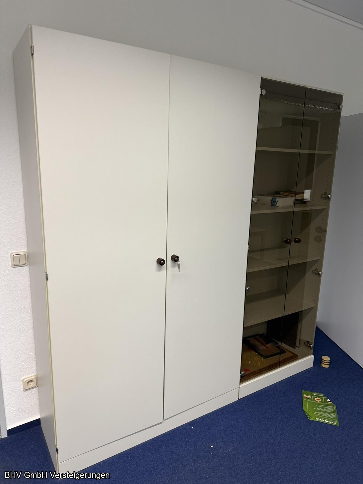 Artikel: 2 x Schreibtischwinkelkombinationen, 1 Aktenschrank mit linksseitigem Flügeltürenschrank, 1 x Aktenschrank mit 2 Flügeltüren linksseitig und 2 Glastüren rechtsseitig, 1 Schreibtisch, 1 x Aktenschrank mit 4 Fachböden, 1 x Aktenschrank mit 2 Flügeltüren, 1 x Aktenschrank mit 1 Flügeltüre, 4 x Aktenschränke.