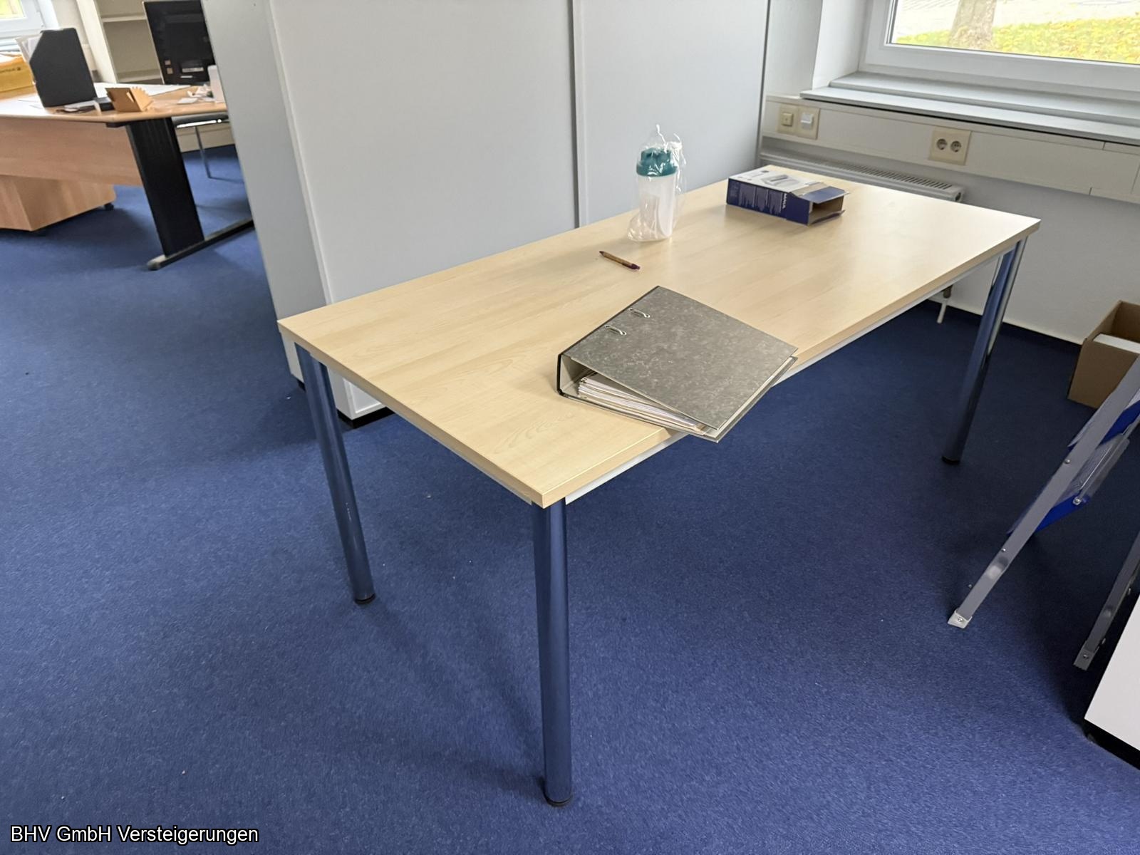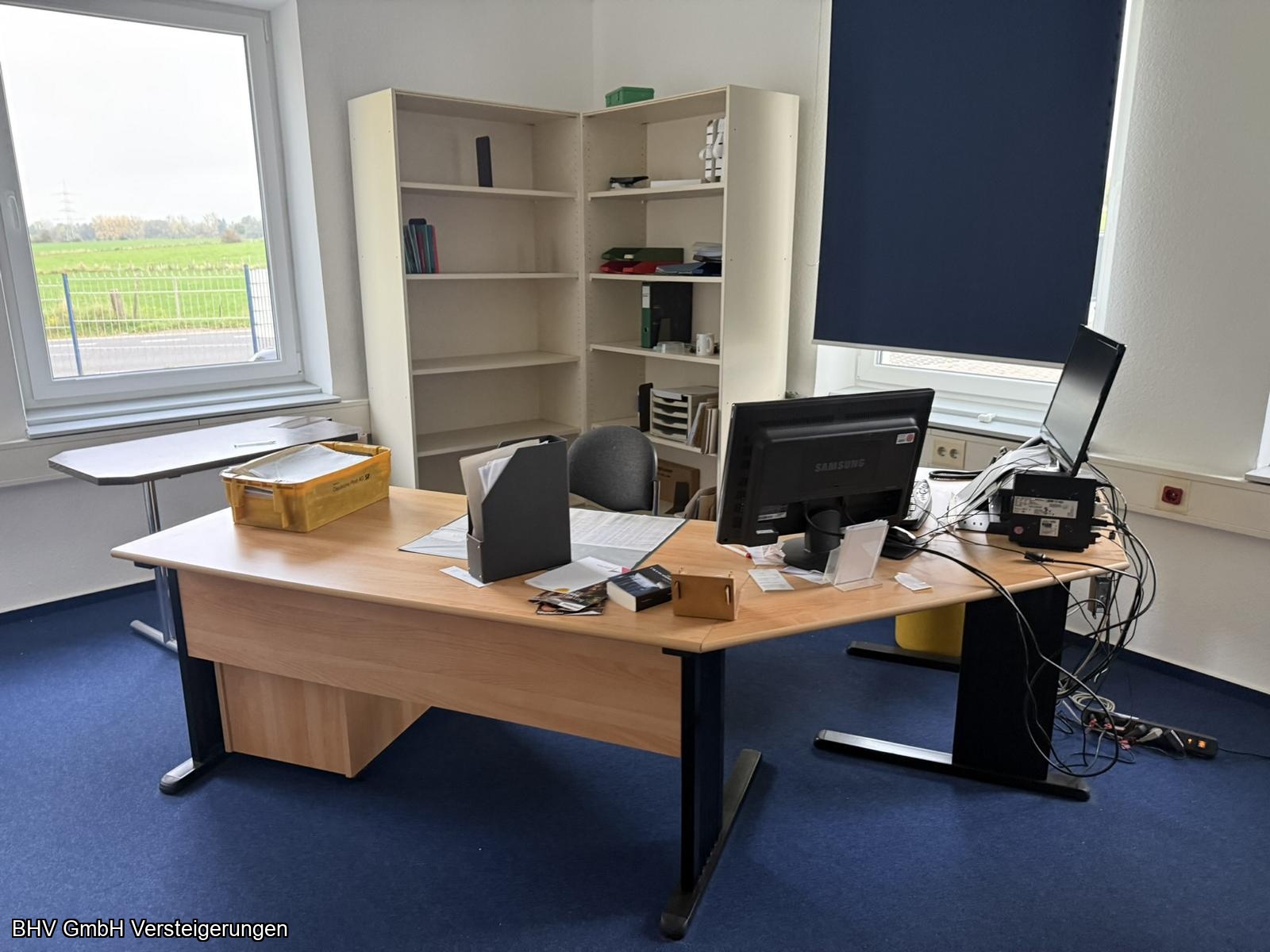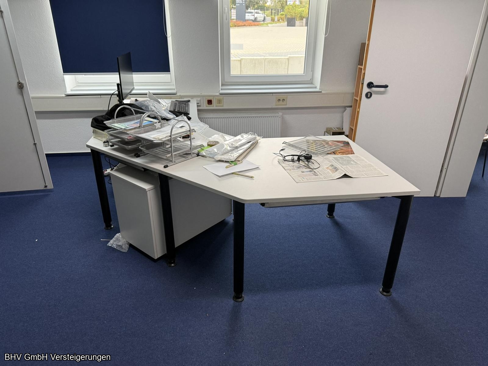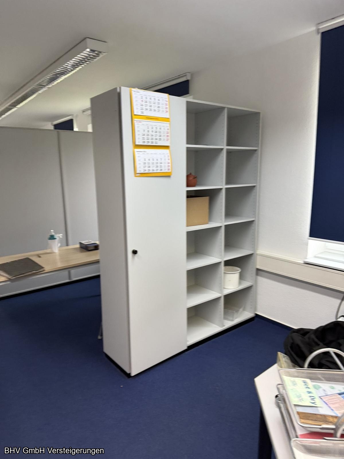 Artikel: 2 x Schreibtischwinkelkombinationen, 1 Aktenschrank mit linksseitigem Flügeltürenschrank, 1 x Aktenschrank mit 2 Flügeltüren linksseitig und 2 Glastüren rechtsseitig, 1 Schreibtisch, 1 x Aktenschrank mit 4 Fachböden, 1 x Aktenschrank mit 2 Flügeltüren, 1 x Aktenschrank mit 1 Flügeltüre, 4 x Aktenschränke.